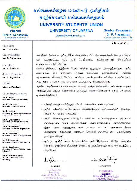 தமிழ் மக்களின் உரிமைகளை வென்றெடுக்கும் அர்ப்பணத்தோடு இருக்கும் கட்சிகளை தெரிவு செய்யுங்கள் கட்சி எல்லைகளுக்கப்பால் தமிழ் மக்களின் உரிமைகளுக்காக அஞ்சாமல் குரல்கொடுக்ககூடிய அடையாளம் கண்டு வாங்களியுங்கள் என மாணவர் ஒன்றியம் தனது அறிக்கையில் வேண்டுகோள் விடுத்துள்ளது.